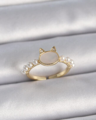 Pirinç Gold Renk Ayarlanabilir Beyaz Mineli Kedi Model İnci Detay Kadın Yüzük