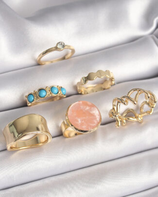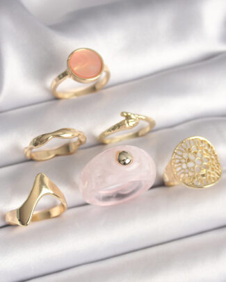 Pirinç Gold Renk Daire Pembe Mineli Zirkon Taş Detaylı 6’Lı Kadın Yüzük Seti