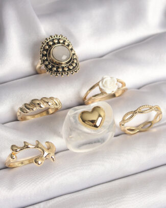 Pirinç Gold Renk Beyaz Gül Figür Kalp İşlemeli Sarmal Detay 6’Lı Kadın Yüzük Seti