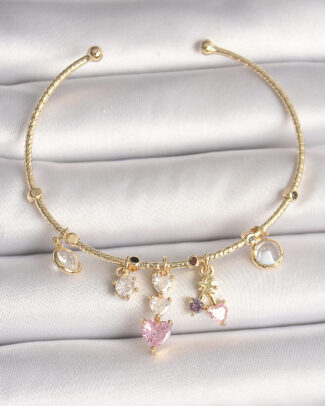 Pirinç Gold Renk Sallantı Zirkon Taşlı Kalp Figür Pembe Kalp Detay Charm Kadın Bileklik
