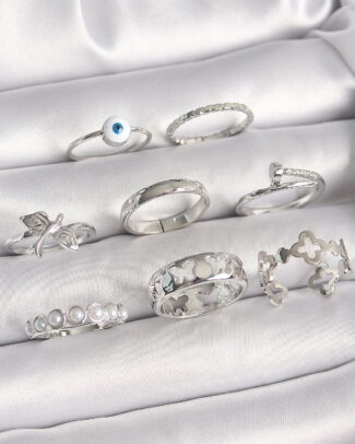 Pirinç Gümüş Renk Nazar Boncuk Detay İncili Kelebek İşlemeli Kadın Yüzük Kombini