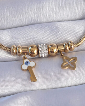 316L Çelik Gold Renk Zirkon Taşlı Yonca Detay Nazarlı Anahtar Tasarımlı Bileklik