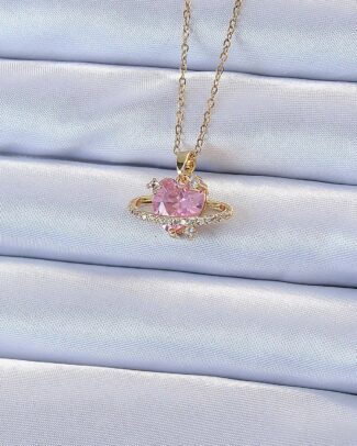 316L Çelik Zincir Altın Renk Pembe Zirkon Taşlı Satürn Görünümlü Kalp Kolye