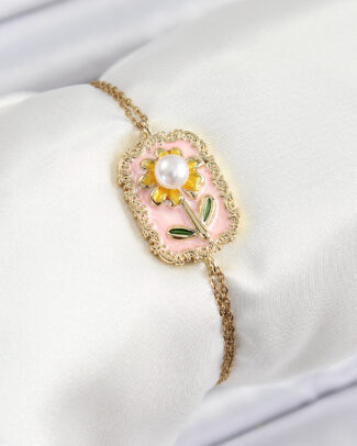 316L Çelik Zincir Pembe Mineli Sanatsal Portre İnci Detaylı Çiçek Model Gold Renk Kadın Bileklik