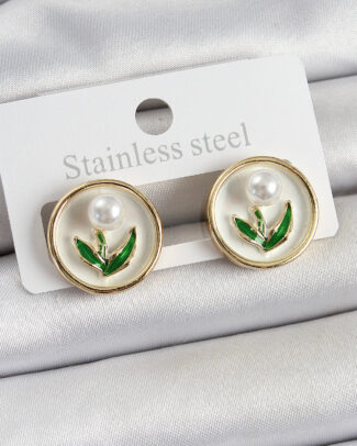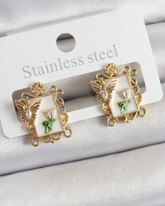 Pirinç Beyaz Mineli Lale Figürlü Sanatsal Portre Model Gold Renk Kadın Küpe