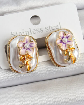 Pirinç Beyaz Mineli İnci Detaylı Çiçek Figürlü Sanatsal Portre Model Gold Renk Kadın Küpe