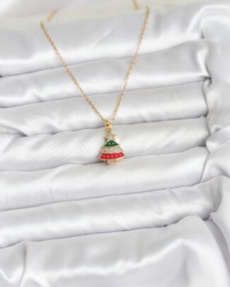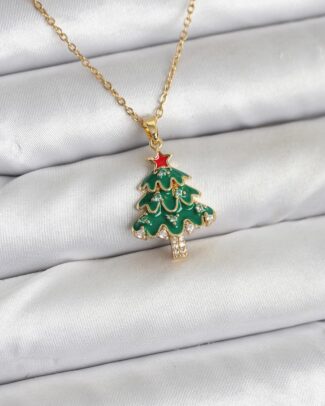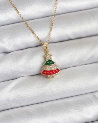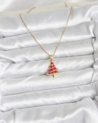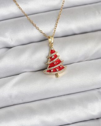 316L Çelik Zincir Gold Renk Kırmızı Çam Ağacı Model Yılbaşı Temalı Kadın Kolye