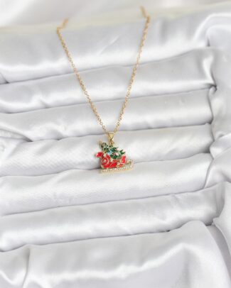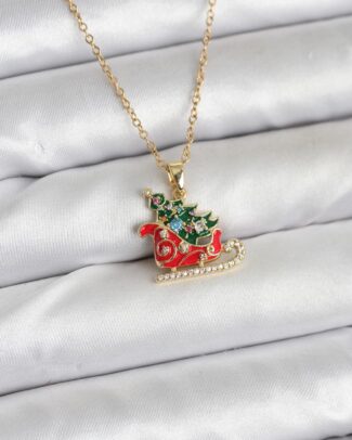 316L Çelik Zincir Gold Renk Kızak ve Çam Ağacı Figürlü Yılbaşı Temalı Kadın Kolye