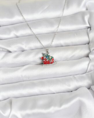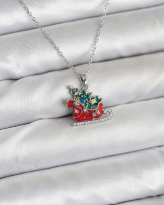 316L Çelik Zincir Gümüş Renk Kızak ve Çam Ağacı Figürlü Yılbaşı Temalı Kadın Kolye