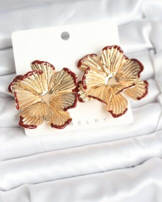 Pirinç Gold Renk Bordo Renk Detaylı Lotus Kadın Küpe