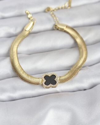316L Çelik Gold Renk Siyah Yonca Model Zirkon Taşlı Yılan Zincirli Kadın Bileklik