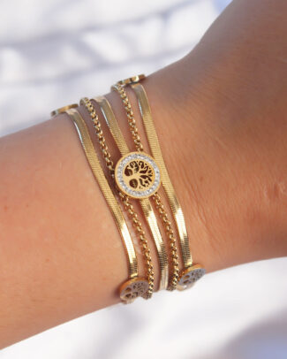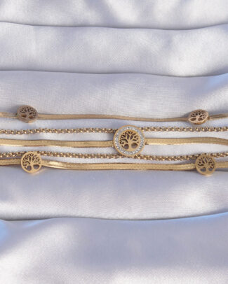 316L Çelik Gold Renk İtalyan Zincir Detaylı Zirkon Taşlı Yaşam Ağacı Tasarımlı Çoklu Bileklik