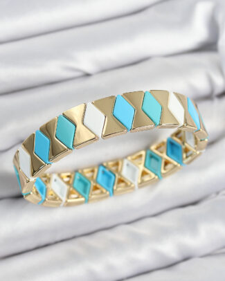 Pirinç Baklava Desenli Mavi Beyaz Gold Renk Lastikli Kadın Bileklik