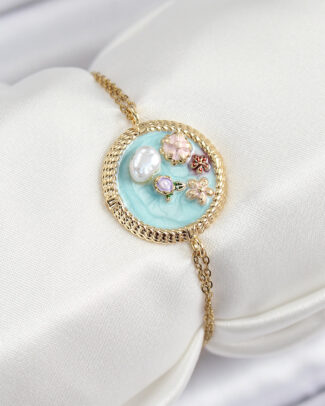 316L Çelik Zincir Turkuaz Mineli Sanatsal Portre İnci Detaylı Çiçek Model Gold Renk Kadın Bileklik