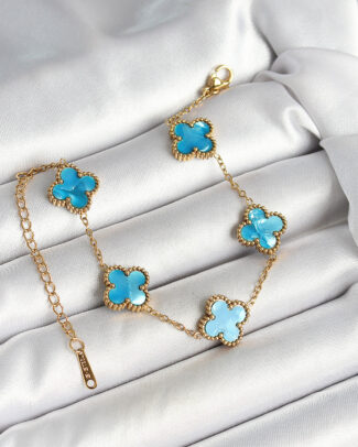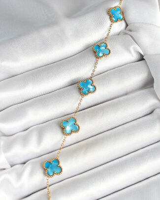 316L Çelik Sedefli Gökyüzü Mavisi Gold Renk Yonca Kadın Bileklik