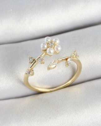 Pirinç İnci Detaylı Papatya Figürlü Zirkon Taşlı Gold Renk Ayarlanabilir Kadın Yüzük