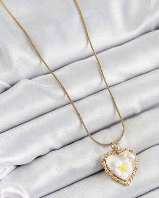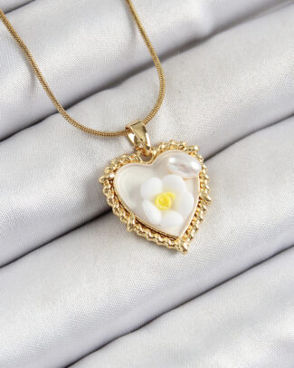 316L Çelik Zincir Beyaz Sanatsal Portre İnci Detaylı Papatya Figürlü Kalp Model Gold Renk Kadın Kolye