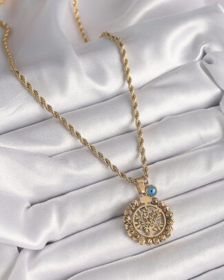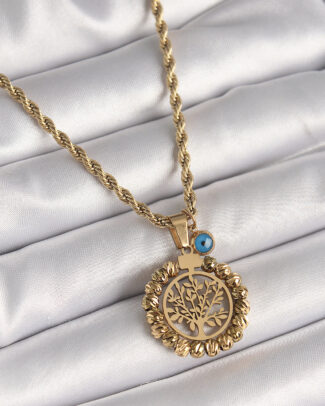 316L Çelik Gold Renk Burgu Zincir Dorika Yaşam Ağacı Figür Nazar Boncuk Detay Kadın Kolye