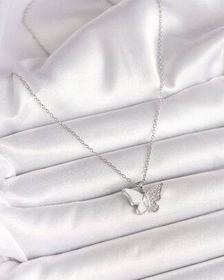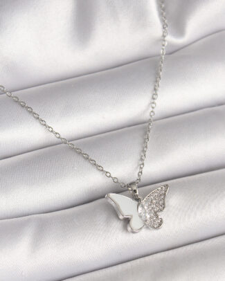 316L Çelik Gümüş Renk Zincir Zirkon Taşlı Beyaz Mineli Kelebek Model Kadın Kolye