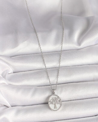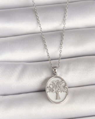 316L Çelik Gümüş Renk Zincir Zirkon Taş İşlemeli Beyaz Mineli Ağaç İşlemeli Portre Model Kadın Kolye