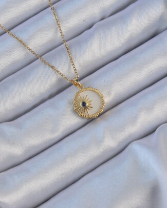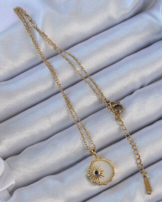 316L Çelik Gold Renk Mavi Boncuk Güneş İşleme Madalyon Model Kadın Kolye