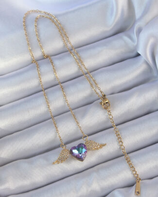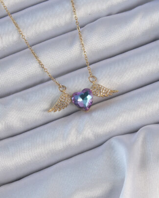 316L Çelik Zincir Altın Renk Mavi Mor Zirkon Taşlı Kanatlı Kalp Kolye