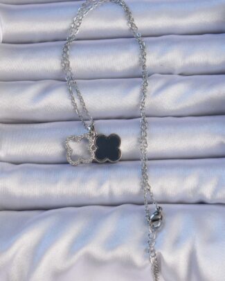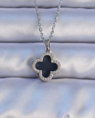 316L Çelik Gümüş Renk Siyah Mineli Zirkon Taşlı Yonca Figürlü Kolye