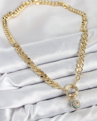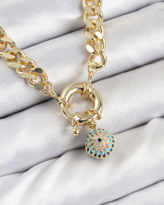 Pirinç Zirkon Taşlı Nazar Boncuk Detaylı Klasik Zincir Model Gold Renk Kadın Kolye