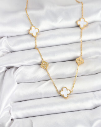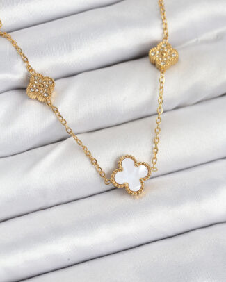 316L Çelik Zincir Gold Renk Beyaz ve Zirkon Taşlı Yonca Kadın Kolye