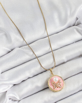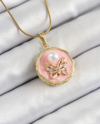 316L Çelik Zincir Zirkon Taşlı Pembe Sanatsal Portre İnci Detaylı Kelebek Model Gold Renk Kadın Kolye