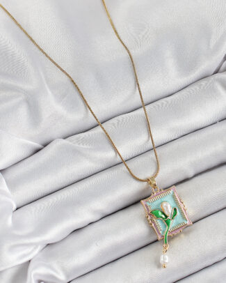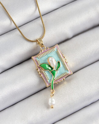 316L Çelik Zincir Turkuaz Sanatsal Portre Sallantılı İnci Detaylı Lale Model Gold Renk Kadın Kolye