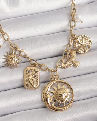 316L Çelik Gold Renk Halka Zincir Sallantı Ay Güneş Figür Kuş Detay Kadın Kolye