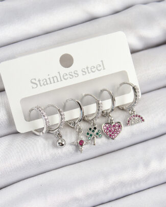 Pirinç Zirkon Taşlı Karpuz Yonca Kalp Pusula Karışık Model Gümüş Renk 6’lı Set Kadın Küpe