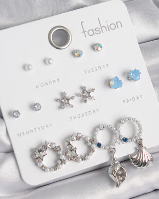 Pirinç Gümüş Renk İncli Zirkon Taşlı Halka Figür Yıldız Detay 7 Çift Kadın Küpe Seti