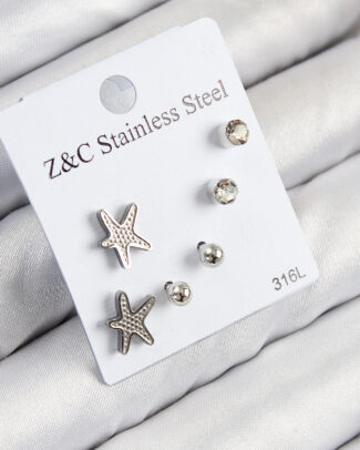 316L Çelik Zirkon Taşlı Deniz Yıldızı Model Gümüş Renk Kadın Set Küpe