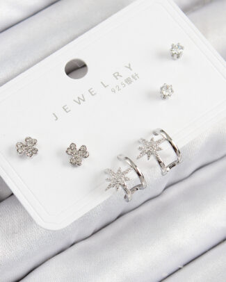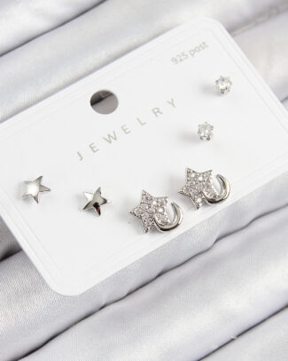 Pirinç Zirkon Taşlı Yıldız Model Gümüş Renk 925 Ayar Gümüş Çivi Kadın Küpe Set