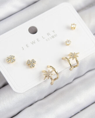 Pirinç Zirkon Taşlı Kutup Yıldızı Model Gold Renk 925 Ayar Gümüş Çivi Kadın Küpe Set