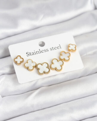 316L Çelik Gold Beyaz Renk 3 Boy Yonca Küpe Seti