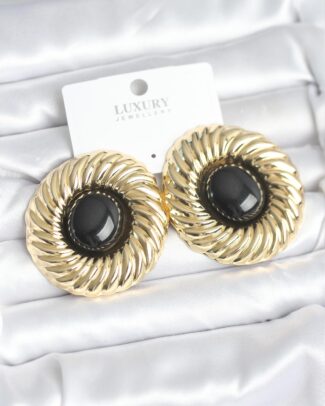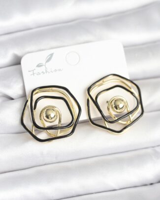 Pirinç Gold Renk Siyah Mineli Geometrik Gül Model Kadın Küpe