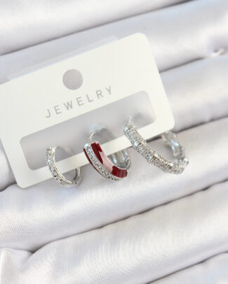 Pirinç Zirkon Taşlı Bordo Pembe Halka Model Gümüş Renk 3’lü Çift Kadın Küpe Set