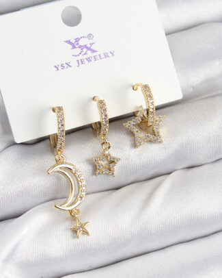 Pirinç Zirkon Taşlı Yıldız Ve Ay Model Gold Renk 3’lü Kadın Küpe Set