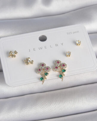Pirinç Gold Renk Renkli Zirkon Taşlı Çiçek Model Yaprak Detay 925 Ayar Gümüş Çivi Kadın Küpe Seti