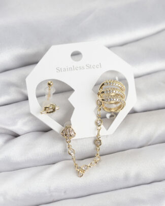 Pirinç Gold Renk Sarmal Model Zincir Bağlantılı Ear Cuff Küpe Seti