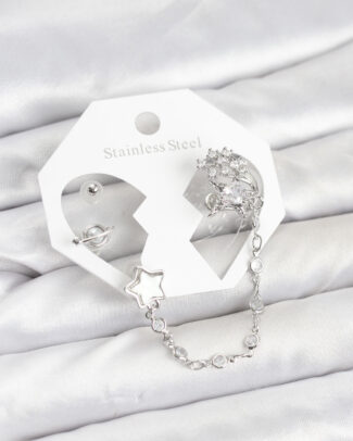 Pirinç Gümüş Renk Yıldız Model Zincir Bağlantılı Ear Cuff Küpe Seti