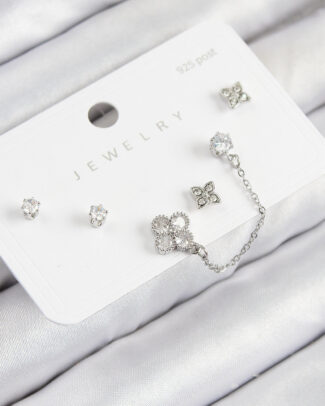 Pirinç Zirkon Taşlı Yonca Model Gümüş Renk 925 Ayar Gümüş Çivi Kadın Küpe Set