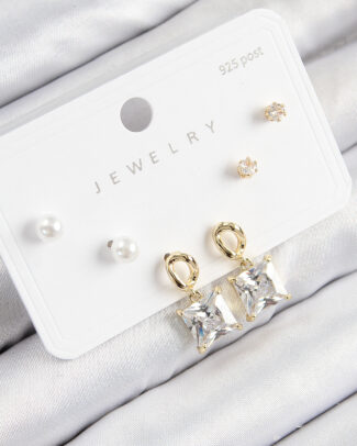 Pirinç Zirkon Taşlı Sallantılı Kare Model Gold Renk 925 Ayar Gümüş Çivi Kadın Küpe Set