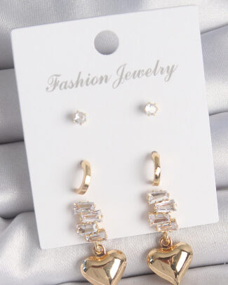 Pirinç Gold Renk Zirkon Taşlı Sallantılı Kalp Model Yarım Halka Detay 3 Çift Kadın Küpe Seti