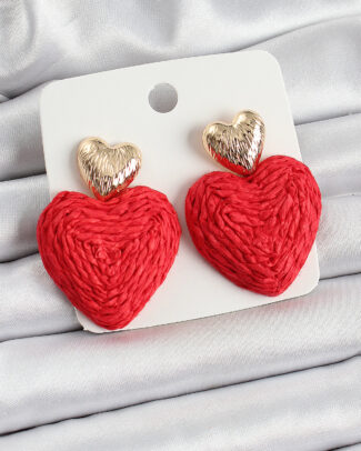Kırmızı Kalp Figürlü Hasır Örgü Model Gold Renk Kadın Küpe