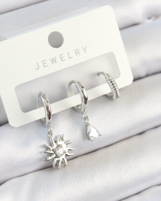 Pirinç Zirkon Taşlı Güneş Model Gümüş Renk 3’lü Çift Kadın Küpe Set