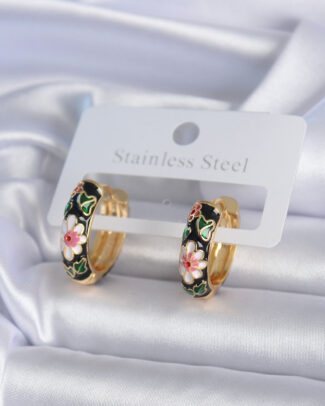 Pirinç Gold Renk Siyah Çiçek İşleme Kadın Küpe